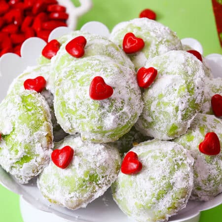Grinch Snowball Cookies are a fun twist on traditional snowball cookies. Made with green food coloring and topped with a red heart sprinkle, these green cookies will have your heart growing three sizes this holiday season.