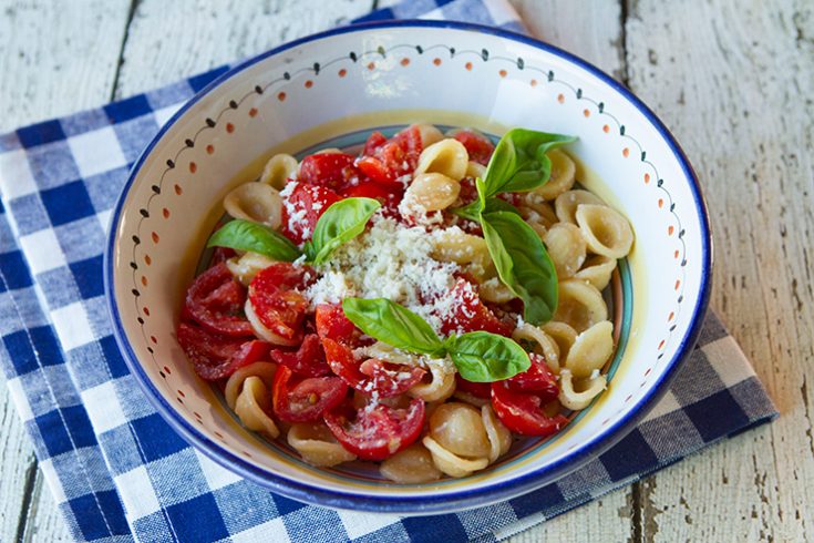 I first tasted this dish on a trip to Puglia in July of 2011, and I have made it many times over the years since then. The first time I enjoyed this pasta, we were in Alberobello, the home of the trulli or cone houses, and it was so hot we didn’t think we could even eat lunch. We stopped at a small restaurant in the old town, and this pasta was served to us. Despite thinking we had lost our appetites due to the heat, we all devoured this pasta and enjoyed every last bite.