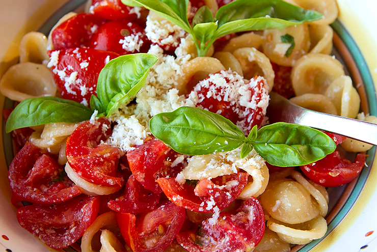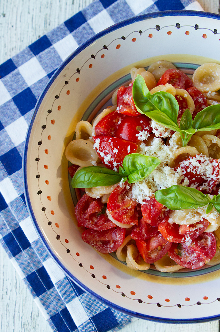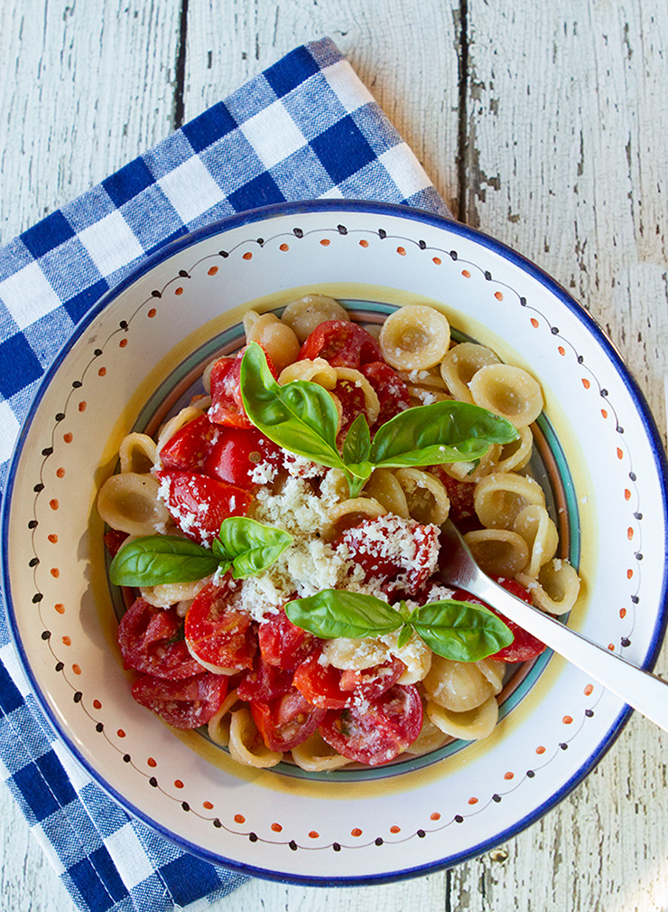 In Puglia, I have only enjoyed this dish with orecchiette pasta which is the traditional pasta shape served with this sauce, but you could use any short pasta shape if you wanted to. Just ensure that you use fresh, very ripe tomatoes, fresh basil, and a good quality extra virgin olive oil. The pine nuts are optional, but they do add a nice crunchy texture to this dish.