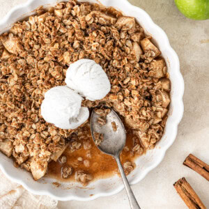 To keep this apple crumble free of dairy, the main swap is in the crumble topping where we use melted coconut oil in place of traditional butter. The result is a really light, crumbly topping with a little bit of crunch.