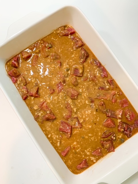 - Next place the beef into the casserole dish.
