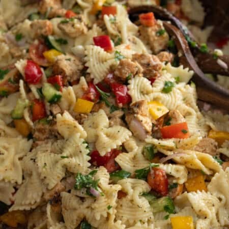 A perfect salad to make for a crowd. Prep the veggies, cook the pasta, and make the dressing ahead. If you are going to serve the salad within a few hours then mix the dressing and let it soak the dressing for 30 minutes – 1 hour. But if you are planning to make a day ahead then it is better to mix the dressing 1 hour before serving.