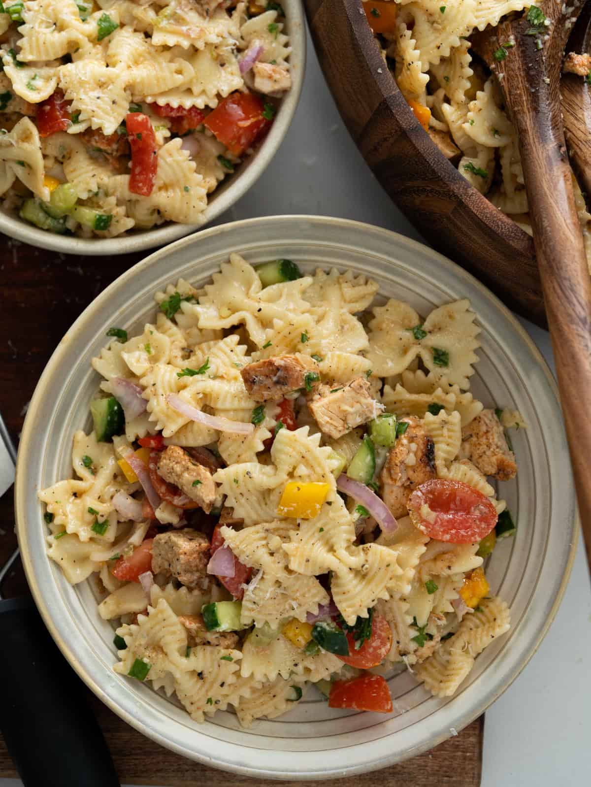 To a large bowl, add chopped grilled chicken, cooked pasta, and chopped vegetables. Pour the salad dressing all over and toss everything until the see the veggies, pasta, and chicken get coated with the dressing.