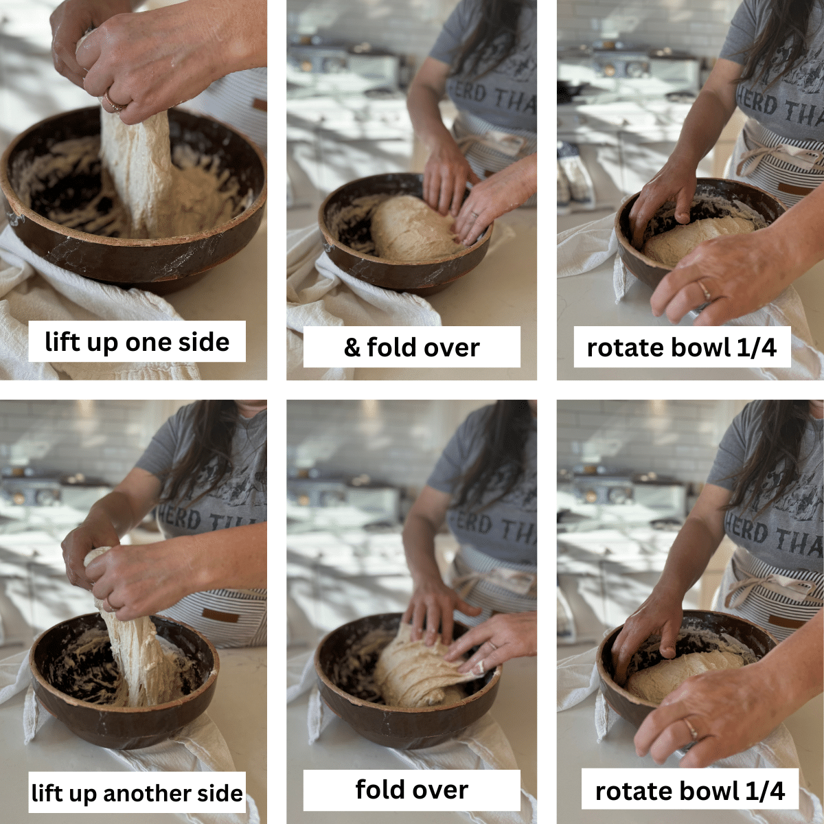 How to do it: With wet hands, grab one side of the dough from underneath, stretch it upward until you feel resistance, and fold it over the center of the dough. Rotate the bowl 90 degrees and repeat on the remaining three sides. That is one set.