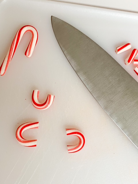 Cut candy cane at the curve with kitchen shears or a knife. It helps if you gently rock the knife back and forth rather than try to chop the candy cane.