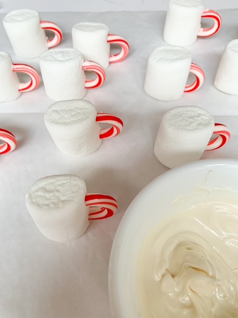 Cut candy cane at the curve with kitchen shears or a knife. - Dip the cut ends of the curved candy cane into the white melted candy coating on the side of the marshmallow and hold candy cane curve in place until it hardens and is secure.