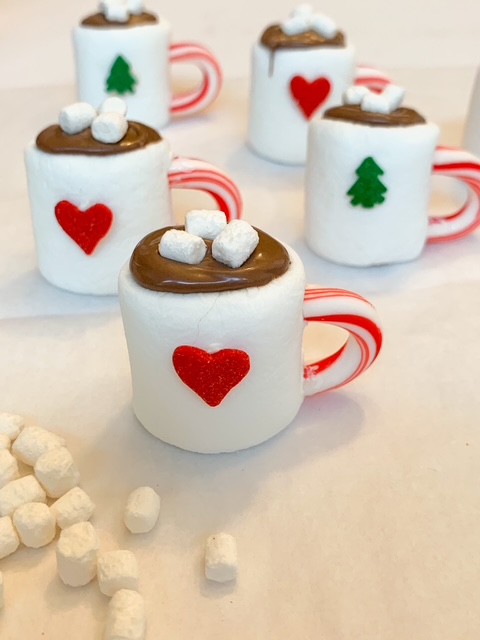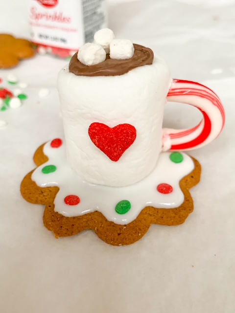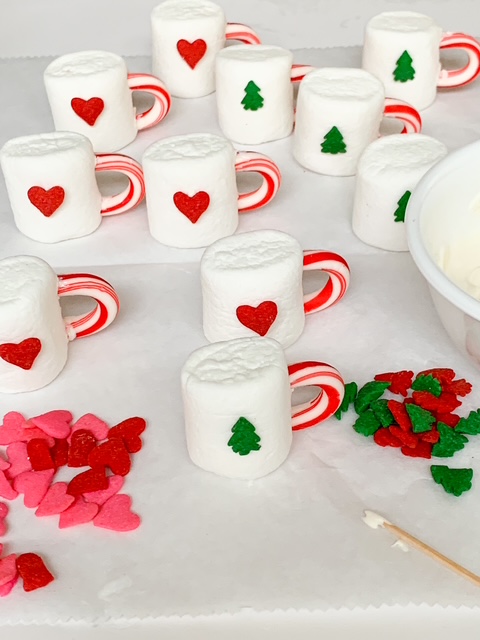 - Attach a jumbo tree or heart sprinkle to the front of the marshmallow using the white candy coating.