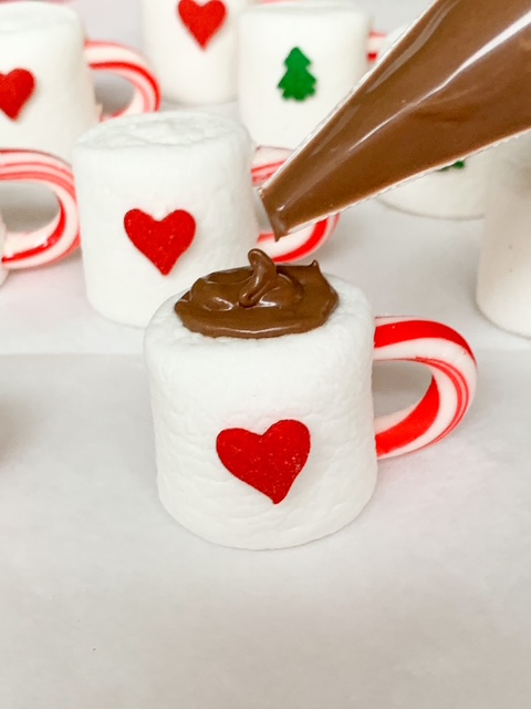 - Melt chocolate candy coating according to package instructions. Then pipe chocolate candy coating on top of marshmallow leaving a small rim.