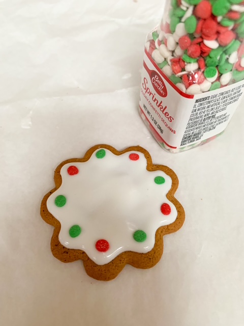 While the cookie icing is still wet, place red and green confetti sprinkles around the outside of the cookie