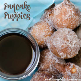 So pancake puppies are basically a pancake version of what is know as hush puppies. Scoops of the pancake puppy batter is fried in oil. Then they are served with a sprinkling cinnamon sugar along with a side of syrup for dipping. They are little morsels of pancake heaven I tell you.