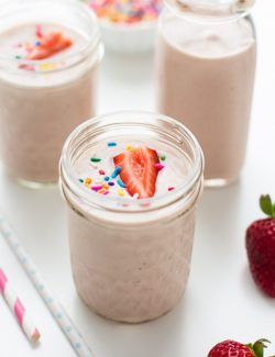 A frothy blend of frozen bananas and strawberries, creamy vanilla yogurt, a few scoops of funfetti cake batter, and sweet vanilla almond milk.