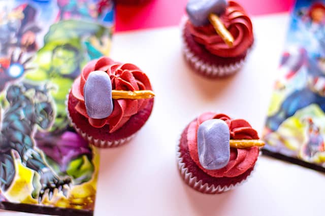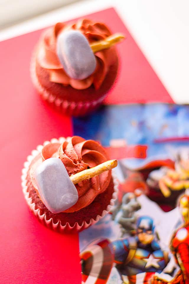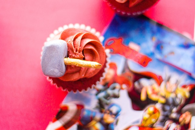 The thor cupcakes are a red velvet cake and topped with a red velvet frosting. Thor’s hammer is made of pretzels and fondant that’s been brushed with luster dust.