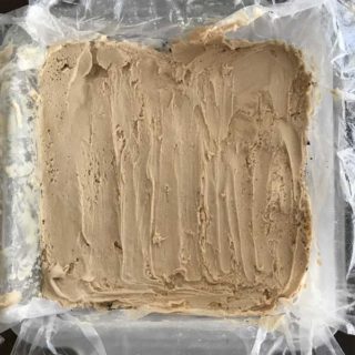 Rather than make it in a large pie dish, I make it in either a 9×13 or 8 inch square dish lined with plastic wrap so that I can lift it out and cut it into neat squares. I then wrap the squares in pairs and put them in freezer bags, so we’ll have ready-to-go pieces of ice cream cake!