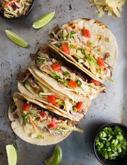 You guys are going to want to go to taco town once you get a look at these Shredded Beef Tacos with Mustard Slaw. Charred flour tortillas get loaded with Guinness-infused shredded beef and then topped with a crunchy mustard slaw.