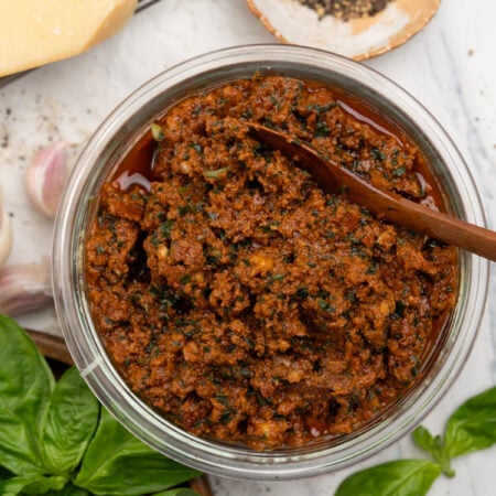 - Use it in salads – Replace the regular pesto with red pesto in this Pesto Salad. The flavors of the red pesto are a bit intense compared to the regular pesto, so exercise caution when adding it. Taste and add more if needed.