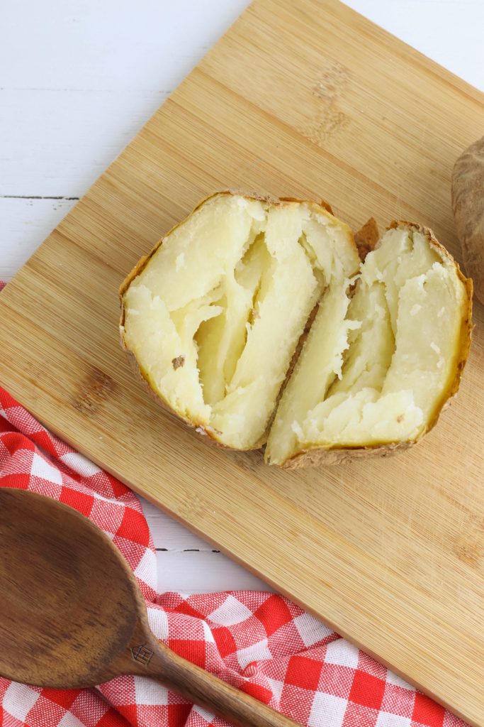 - Remove the potatoes from the oven and allow to cool enough to touch. Slice each potato in half and remove the cooked potato from the inside and place it in a large bowl.