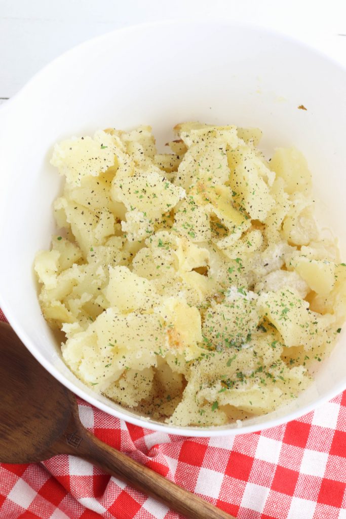 Remove potatoes from oven and allow to cool enough to touch. Slice each potato in half and remove the cooked potato from the inside, leaving the potato skins behind. Place in a large bowl.