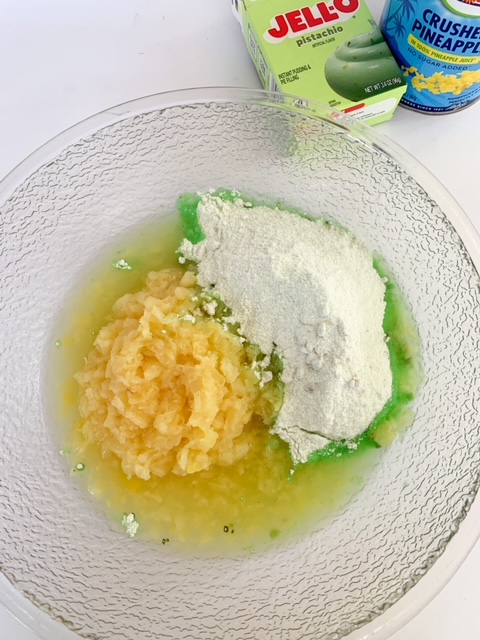 First place the 2 boxes (dry) of instant pistachio pudding and the undrained can of crushed pineapple in a large bowl.