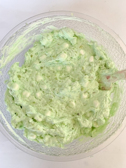 Finally fold the marshmallows and Cool whip in with the pistachio pineapple mixture until thoroughly combined.