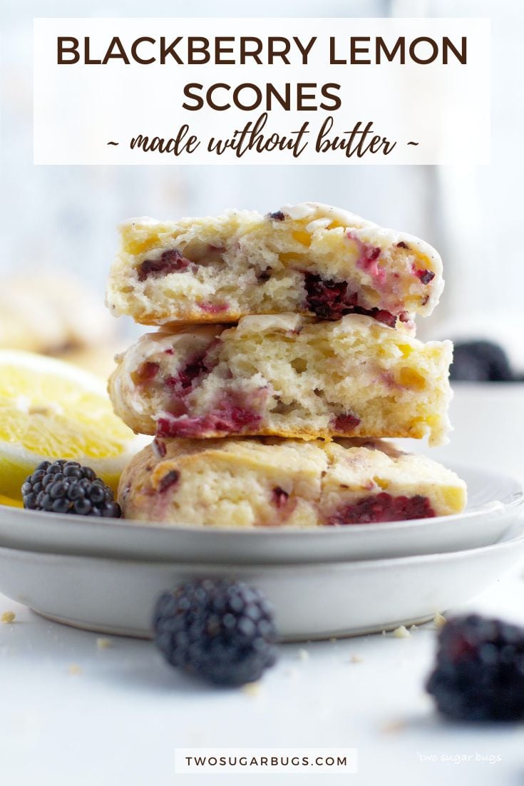 This easy blackberry lemon scones recipe is made without butter and makes soft and moist scones. Drizzled with a tart lemon glaze.
