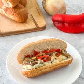 Then don’t forget about the cheese. I add the provolone top of the chicken once it’s cooked. Then give it a minute or to to melt before compiling the sandwich. Serve it up on a good roll. Traditionally it’s on a soft Italian roll or baguette. I like to get the hoagie rolls from my local Kroger bakery. The roll just needs to be soft but sturdy enough to be an ideal vessel for that filling.