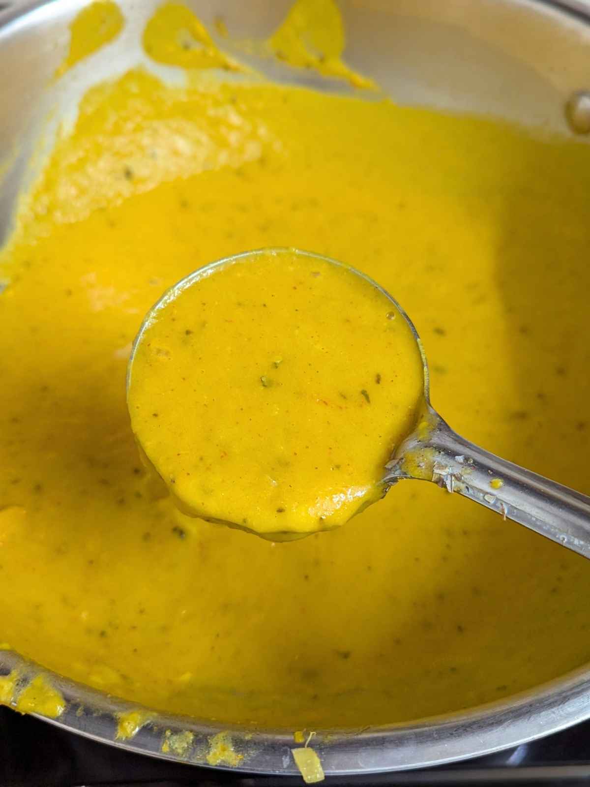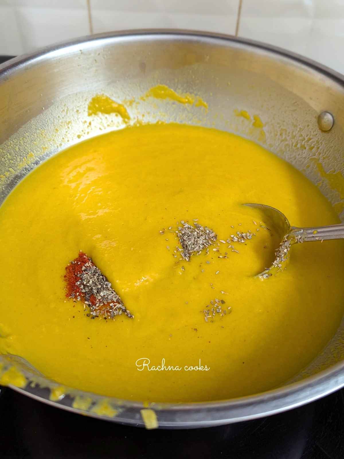 Place it back in the pan and turn on the heat. Add 1 cup of almond milk and stir well to slightly thin down the soup. Bring it back to a boil. Add in 1 tsp. dry oregano, ½ tsp. salt, 1 tsp. smoked paprika, ¼ tsp. turmeric (optional) and 1 tsp. pepper. Mix well. Taste and adjust seasoning.