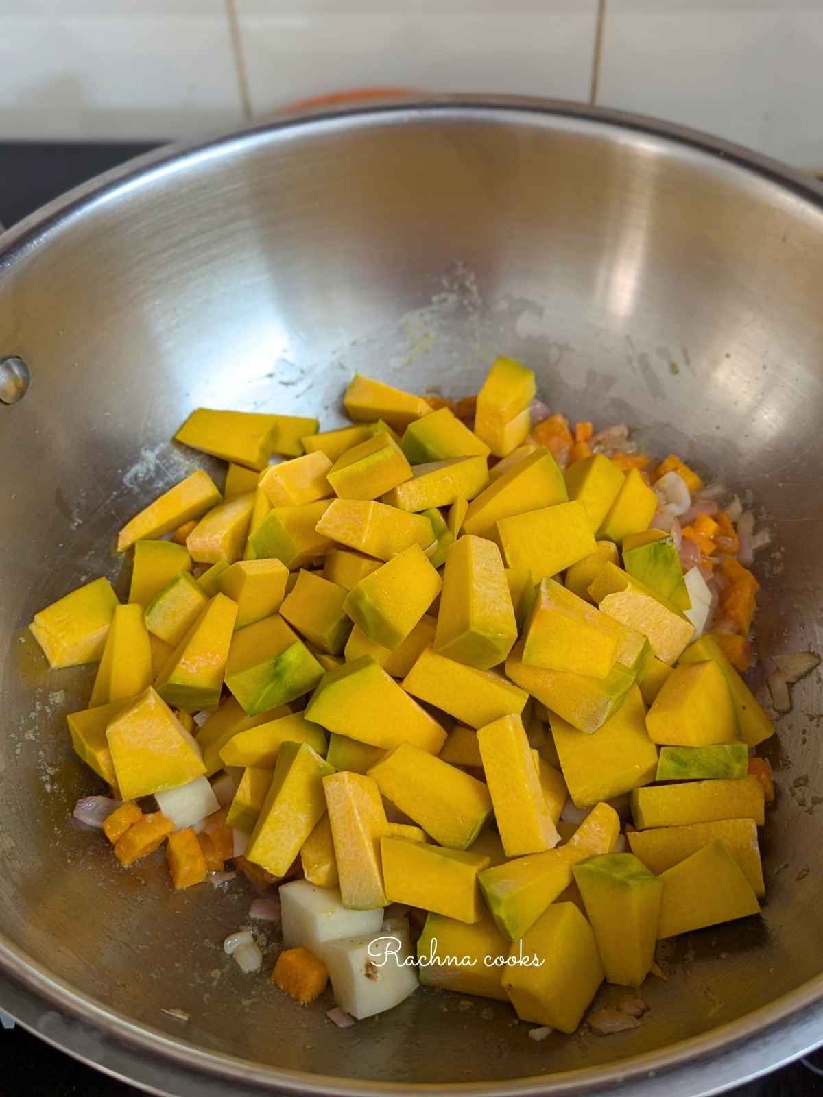 Add minced ginger and garlic and saute for a minute more. Now add in the potato and butternut squash and saute for 3-4 minutes.