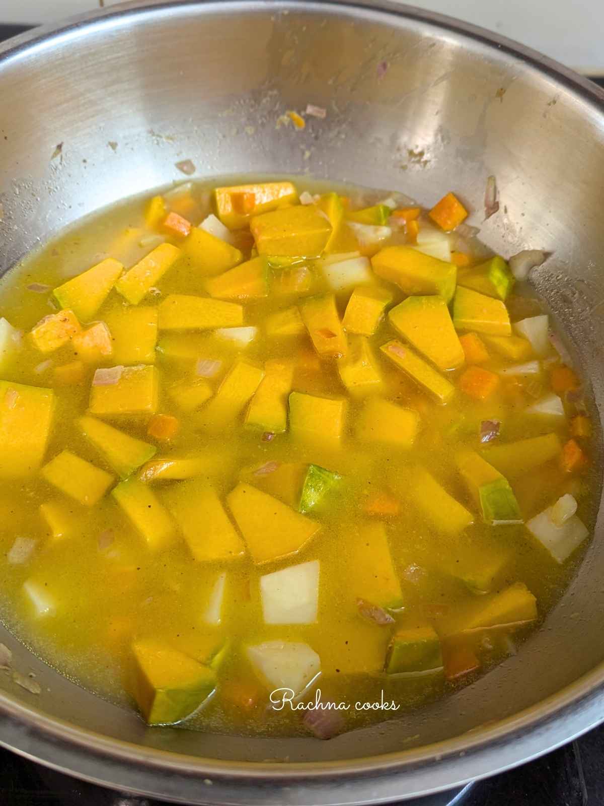 Add in 3 cups vegetable broth. Cover and cook after bringing the stock with vegetables to a boil. Simmer for about 20 minutes till butternut squash is cooked through and mushy. Cool down the veggies a bit and then using an immersion blender or a regular blender, blend all the veggies to a thick soup.