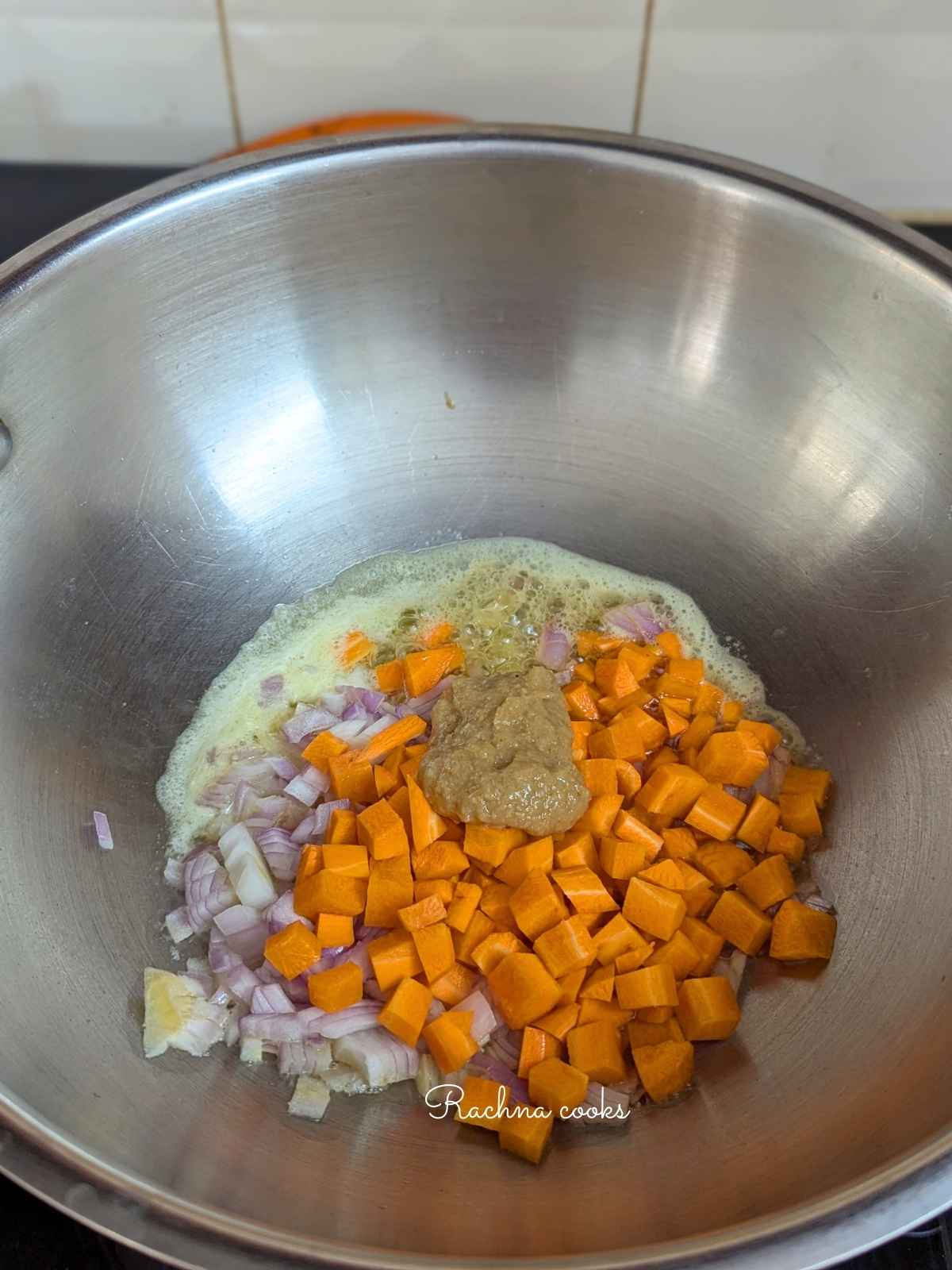 Peel and chop one medium potato and 1 carrot. Dice 1 onion and mince ginger and garlic or use paste. Heat pan and take 2 tbsp. vegan butter or olive oil. Add diced onion and carrot and saute for a couple of minutes.