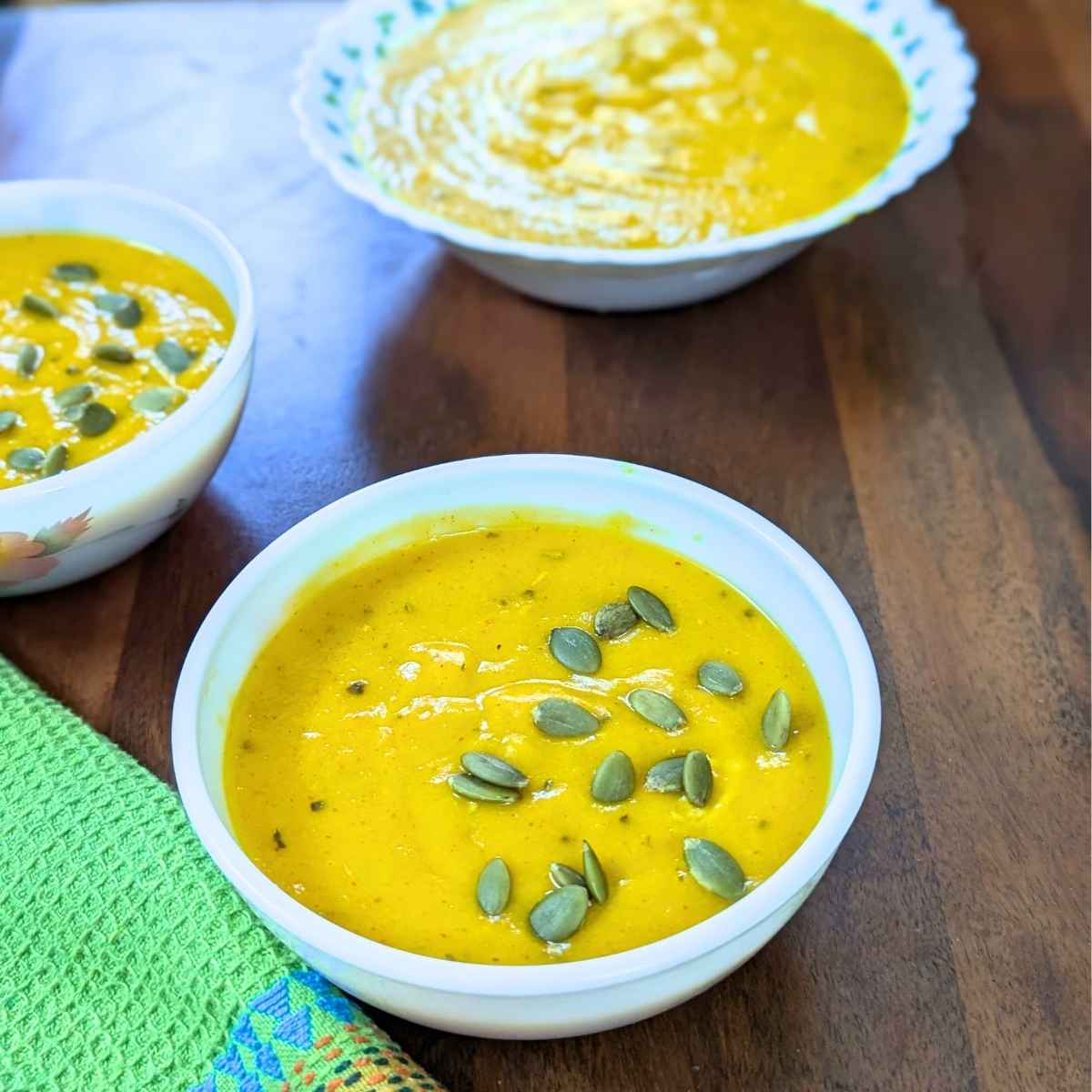 Garnish: Toasted Pumpkin seeds taste delicious as a garnish for this soup. You can also add herbs like rosemary or sage here.