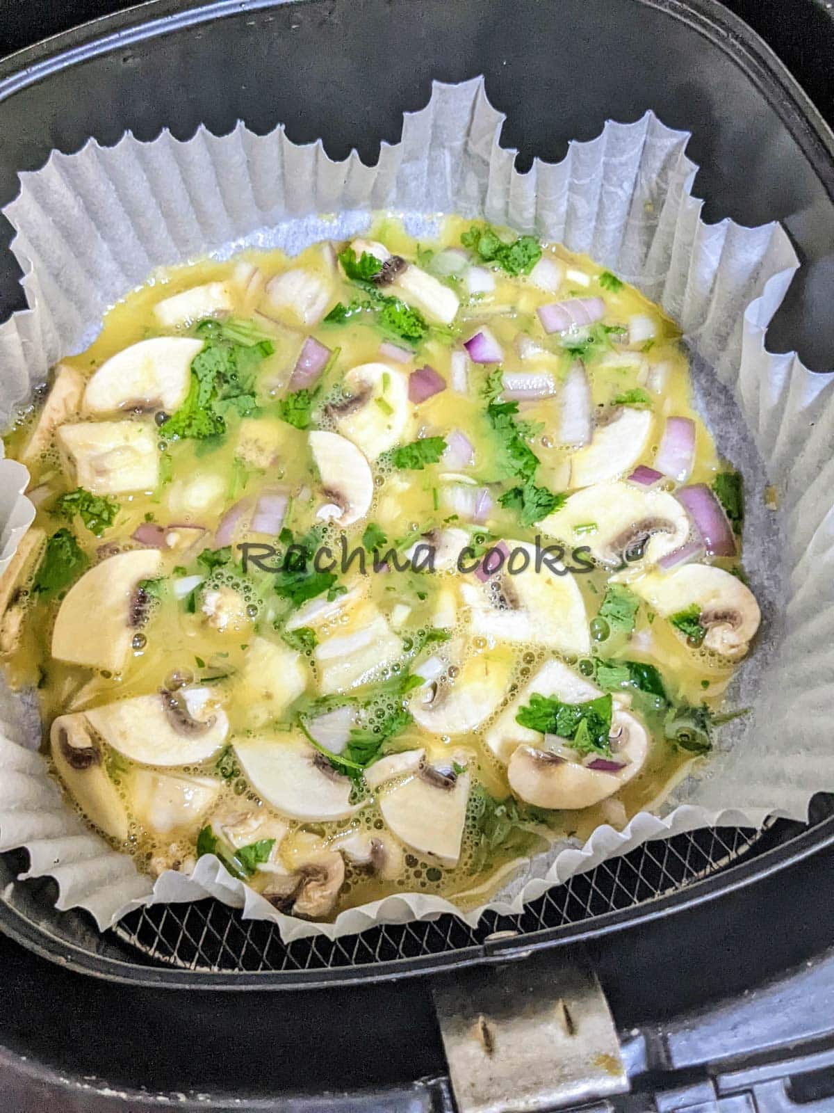 Take your air fryer basket. Take a 6″ cake tin and line with parchment paper. I had a parchment paper dish that I used. Pour your egg mixture into the cake pan. If using paper dish, place the parchment paper dish safe for oven use inside air fryer basket and then pour in your egg mixture.