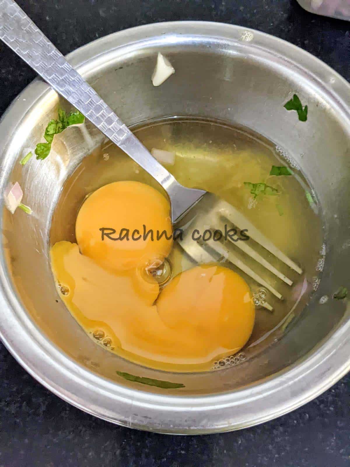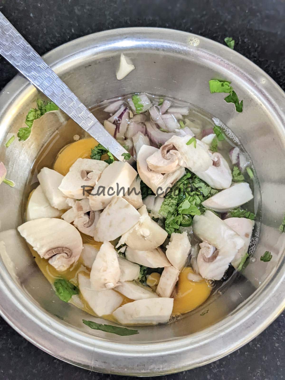 Add the chopped veggies along with salt and pepper. Here I have used chopped onion, green chilli, cilantro, mushroom, salt and pepper.
