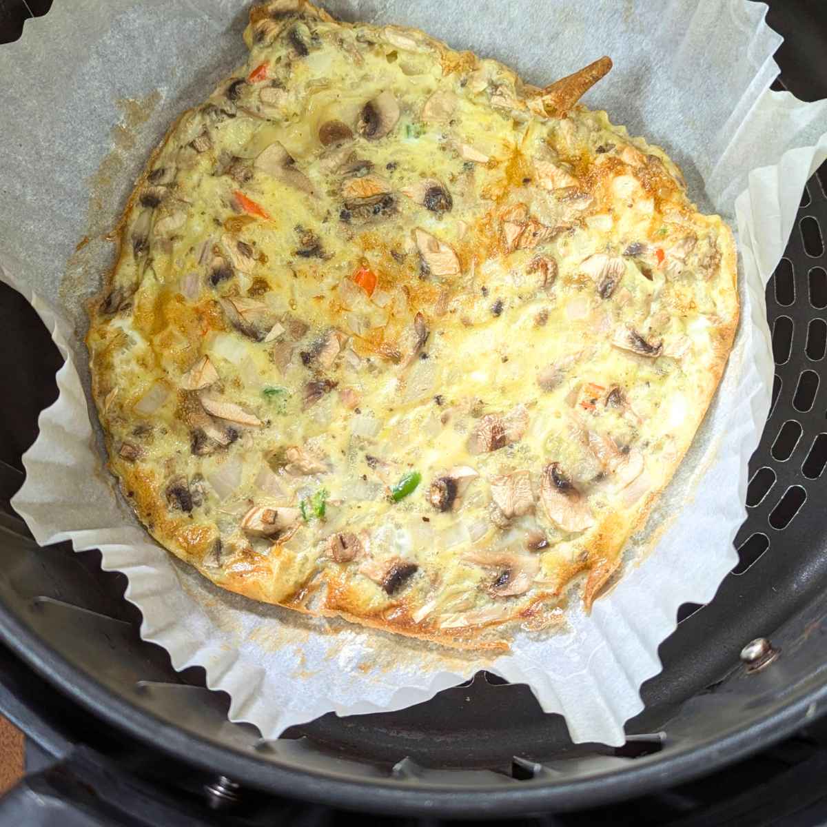 3. The omelet is well cooked and fluffy while being golden brown on top. You need not supervise at all which is my favorite part. 4. Always use parchment paper with food on top or it can fly to the heating element and burn. Never use it during preheating. Also all oven-safe cookware are safe to use in air fryers. 5. This is a super easy and supervision free method of making perfect omelettes at home that are also super healthy.