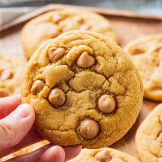 If you’re not a fan of butterscotch chips, I have other cookies recipes like my Classic Chocolate Chip Pudding Cookies that are made with vanilla pudding mix and regular chocolate chips. You could always just use a different kind of chocolate chips but there is still the butterscotch pudding mix. Then you would have a completely different cookie! hand holding a baked butterscotch chip cookie