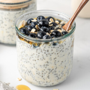 Overnight oats in a jar topped with fresh blueberries and a spoon.