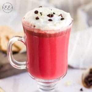 Red Velvet Hot Chocolate is a delicious warm beverage made from scratch with white chocolate. Red food coloring gives it that classic red velvet look.