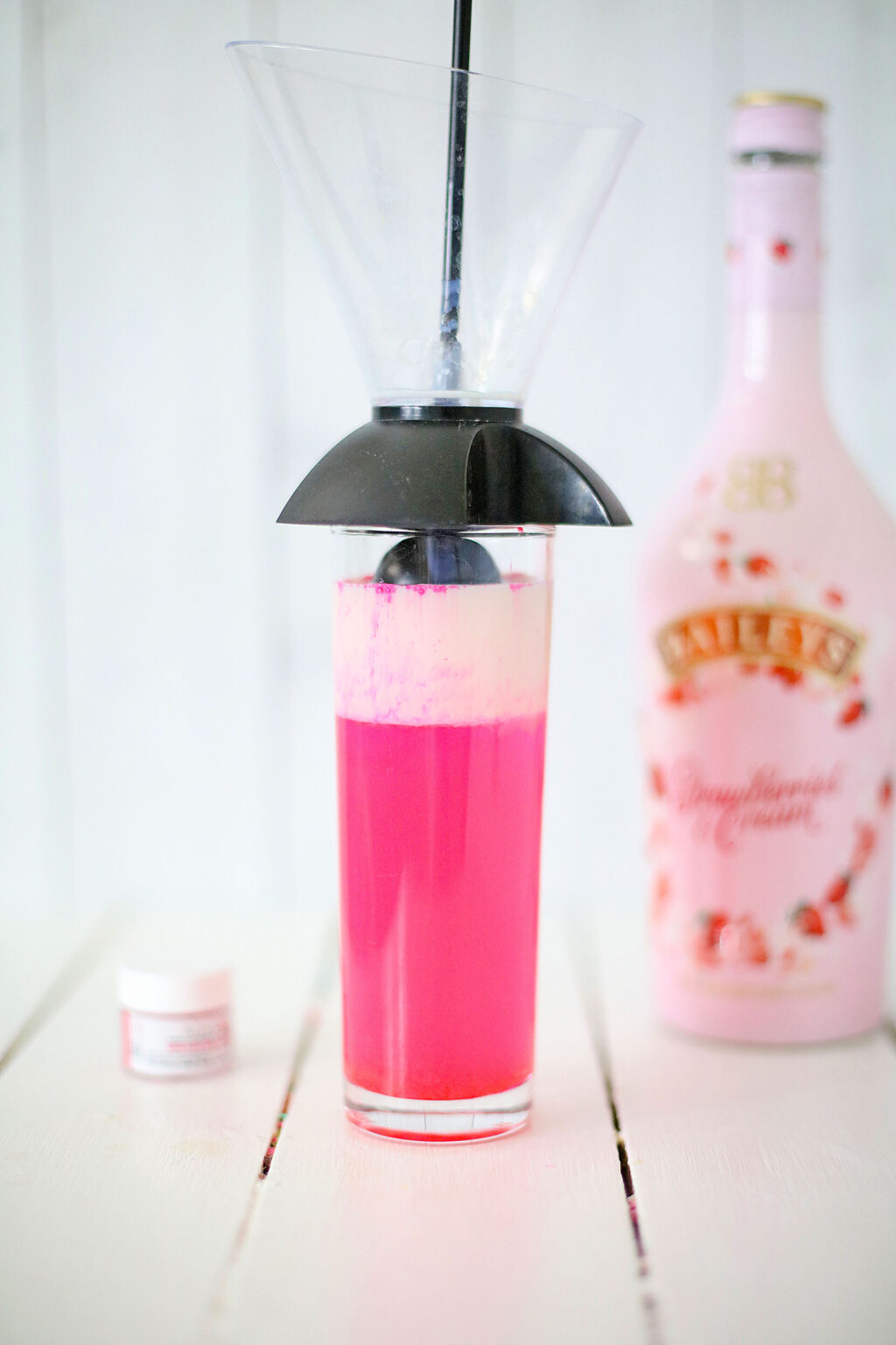 Next, place your drink layering mix tool on top of pink ginger ale layer and pour in 1/3 cup of bailey’s and allow it to trickle down and settle on top of the pink shimmer layer.
