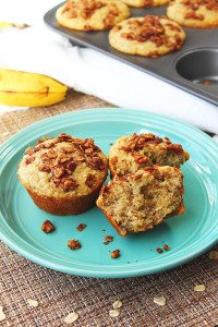 These wholesome muffins have a sweet nutty topping that you don’t want to miss! Of course, it’s optional, but the spiced pecans add loads of crunch and flavor. Feel free to try something different with your toppings like maybe a banana pudding-like icing, or a slather of peanut butter for extra flavor and protein.