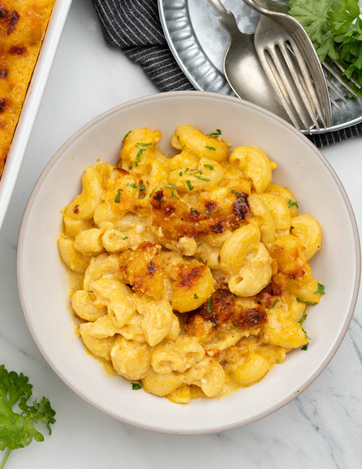 7. Serve: Let the baked mac and cheese cool slightly for 5 minutes before serving. Any longer, the pasta will absorb more liquid and become mushy. Garnish with fresh herbs like parsley if desired.
