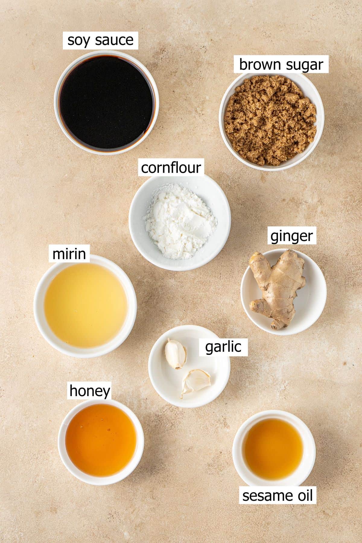 In a small saucepan, combine the soy sauce, brown sugar, ginger, garlic, honey, sesame oil, and mirin. Stir in the cornflour mixture until well combined.