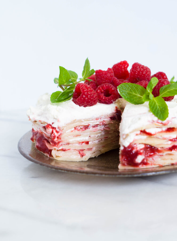 - Assemble the vegan crepe cake by starting with one crepe on a plate, then top with jam and cream then repeat until you have used all of the crepes. Top the last crepe with jam then vegan whipped cream and fresh fruit and mint leaves.