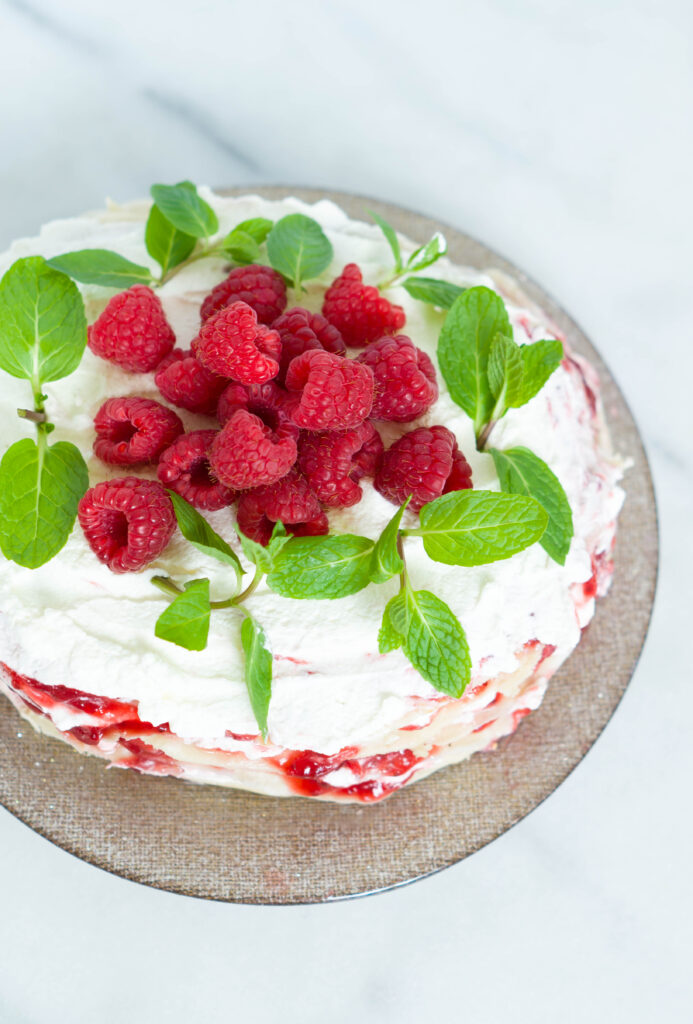 Step 5. Top your vegan crepe cake with fresh fruit and mint!