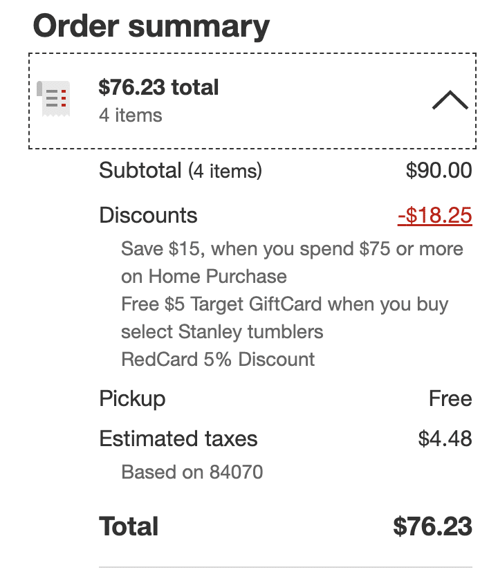 Now, if you have a Target Red Card, you’ll get an additional 5% off your purchase making your total around $71.75 (+ tax).