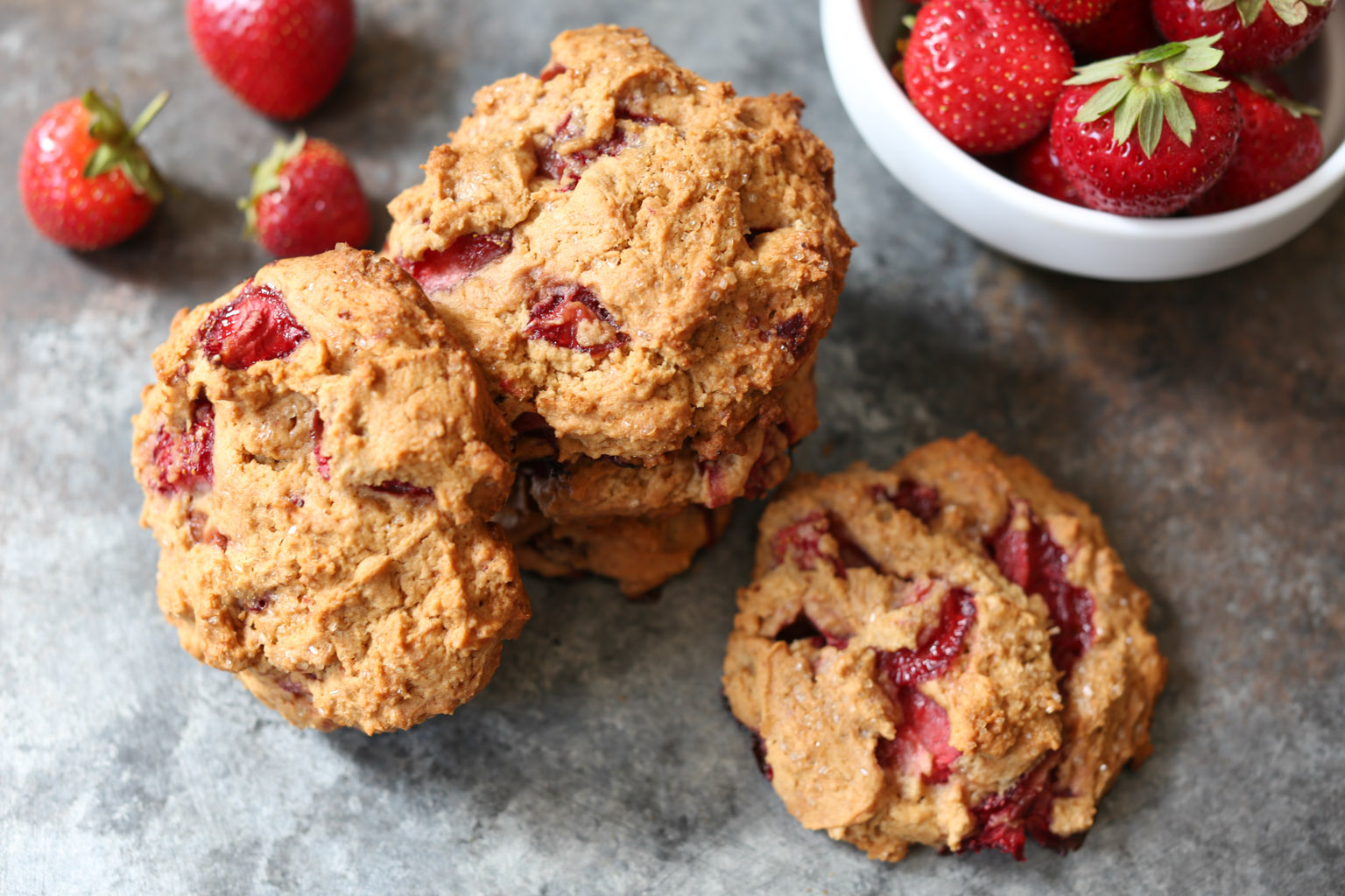 These babies are sweetened with coconut sugar (although you could also use regular cane sugar), and I subbed coconut cream for heavy cream in my batch, which gave them an extra hint of coconutty goodness. I ate three one with tea and felt very British, but they’d also be great for breakfast. Not to get too wild, but I’d recommend slathering one with Greek or coconut yogurt and topping it with extra sliced strawberries…