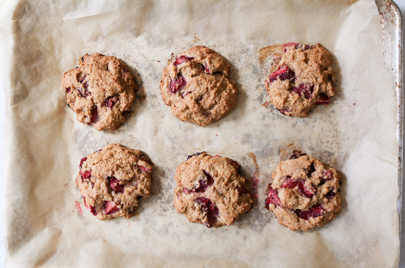 Deciding which recipe to make first was nearly impossible, but I ultimately went with these scone cookies because they’re a mash-up of two of my favorite things. Plus, I just happened to have a boatload of strawberries in my fridge awaiting such a fancy fate. The recipe makes 6 large (or 12 small) not-too-sweet treats with the most addictive texture—like a fluffier scone with a crispy exterior and a little extra chew. (That makes sense…right?) Christina is obviously a mad genius.