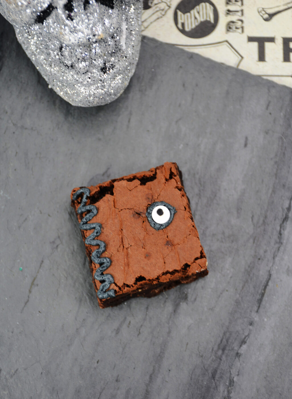 Carefully place the ‘spell book’ brownie on the frosting of the swirled frosting.