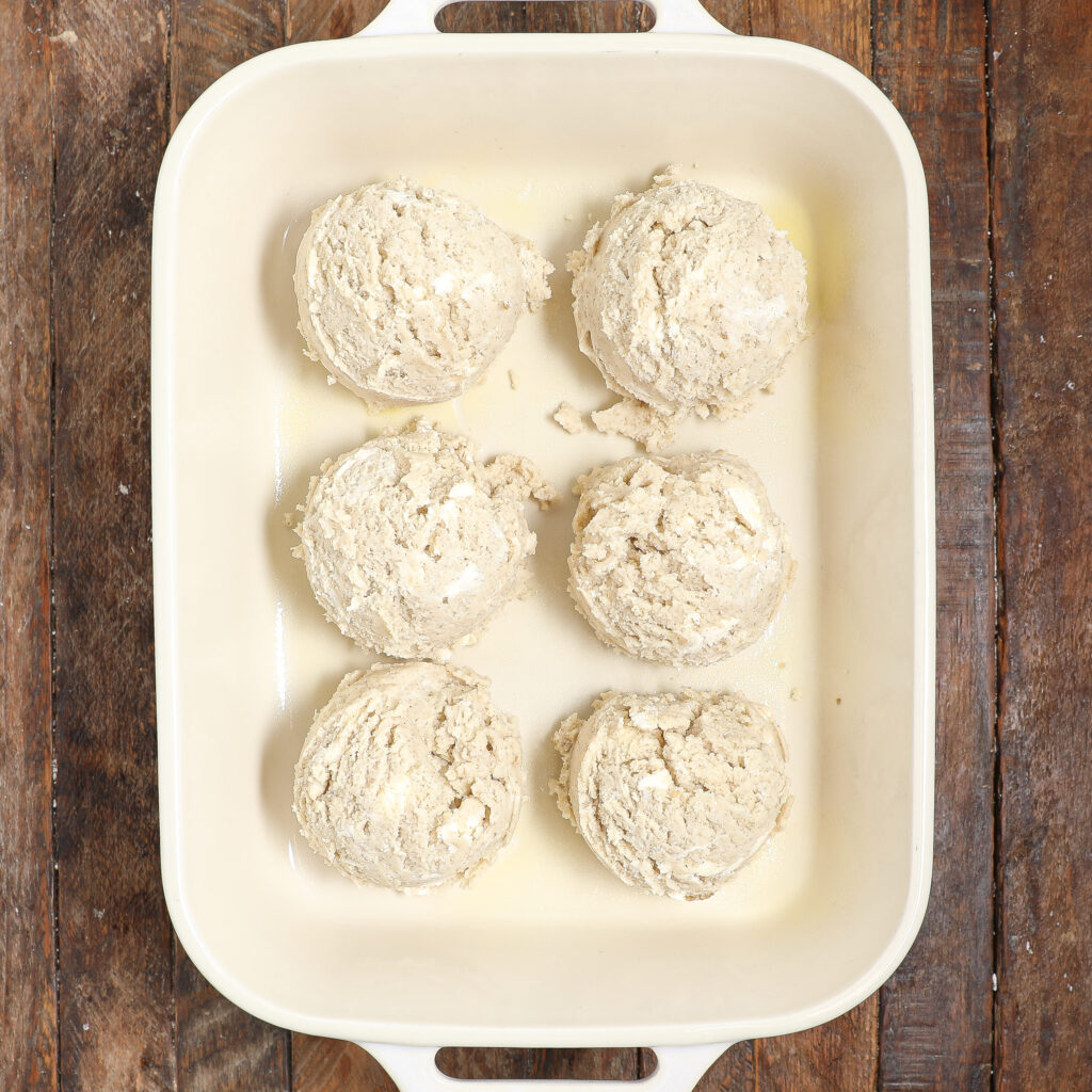 Place the dough in the freezer for 20 mins. Afterward, use a large ice cream scoop to form 6 large biscuits in the baking dish.