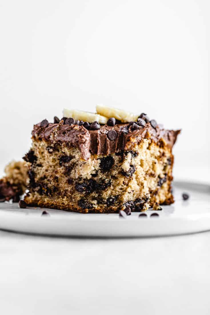 This Chocolate Chip Banana Cake is perfectly moist, soft and fluffy. Made with ripe bananas, studded with sweet chocolate chips and topped with silky chocolate cream cheese frosting, this simple sheet cake will be your new favourite!