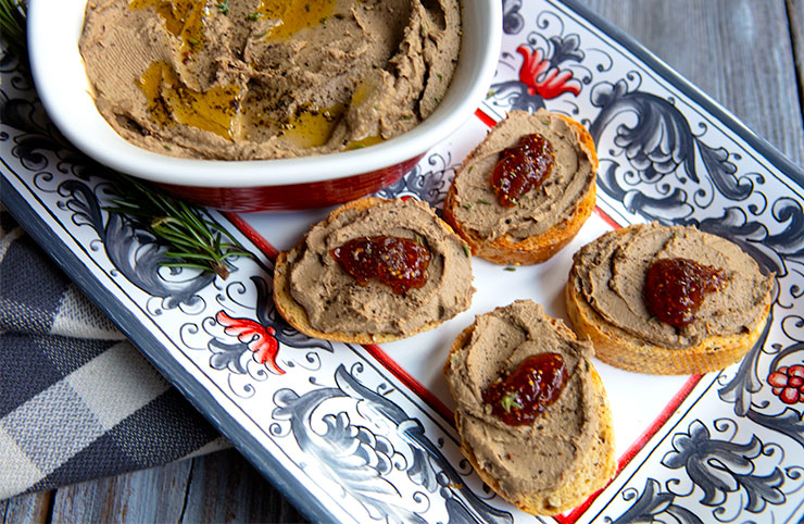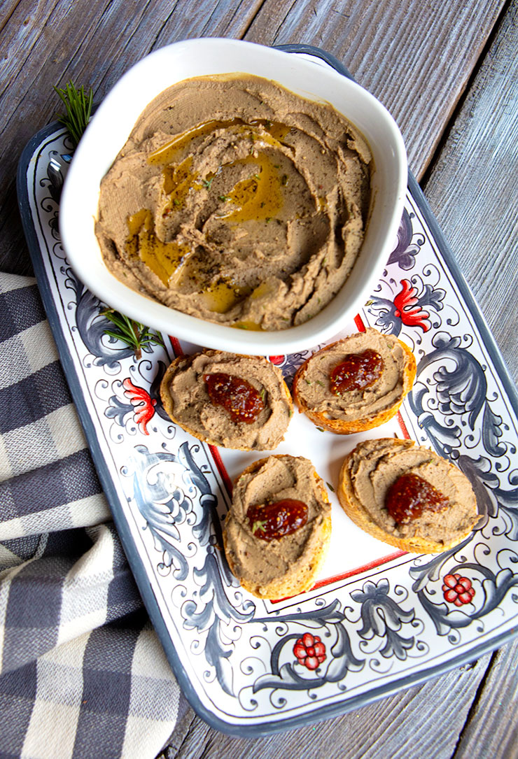 To serve my pate, I also added a small spoonful of fig jam which finished off the bruschetta perfectly. Add a sprinkling of fresh thyme leaves, and you have an appetizer that everyone will enjoy, including those who do not care for liver. This pate can be made ahead of time and stored in an airtight container in the refrigerator for up to two days.