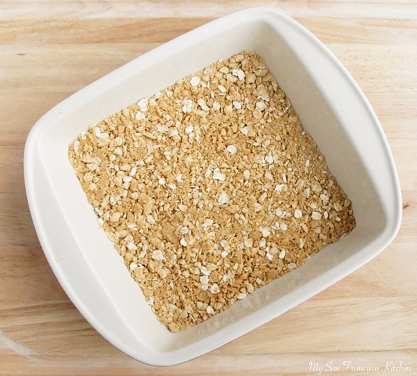 - Add the graham cracker oat mixture to a 13×9 inch greased pan (you can also line with parchment paper) and drizzle the melted butter over.